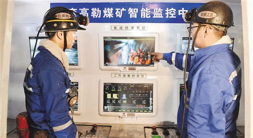 在山東能源淄礦集團巴彥高勒煤礦綜采工作面智能化集控中心,6臺防爆電腦清晰顯示著工作面所有支架的壓力及狀態(tài)、采煤機的運行參數(shù)、煤壁及支架視頻影像。它與地面集控中心的顯示器相連,可以在地面控制井下300米長工作面上的所有設備。職工“礦三代”趙昌圣點動鼠標,屏幕中采煤機滾筒迅速打開噴霧,連接運輸機的順槽皮帶輸送機也隨之運轉起來,隨著采煤機的推進,滾滾“烏金”順著順槽皮帶經(jīng)主井提升到地面。
